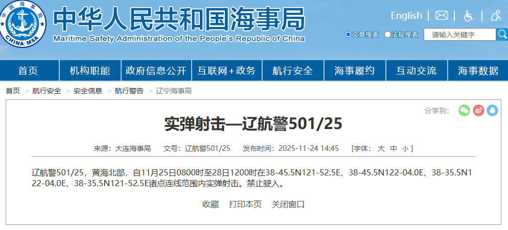 辽航警501/25,黄海北部,自11月25日08:00时至28日12:00时在38-45.5N121-52.5E、38-45.5N122-04.0E、38-35.5N122-04.0E、38-35.5N121-52.5E诸点连线范围内实弹射击。辞谢驶入。